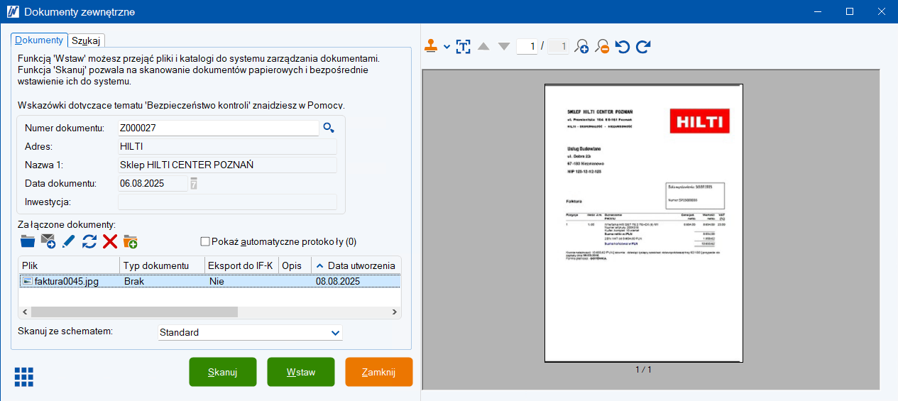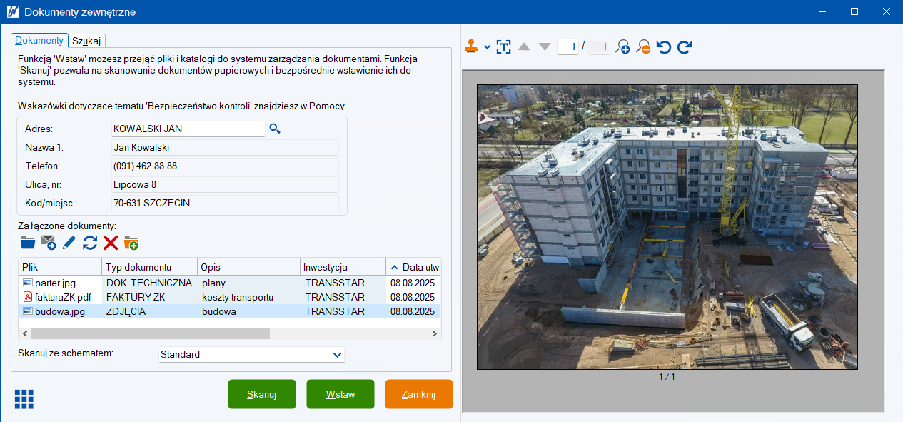 Skanowanie dokumentów bezpośrednio w programie: Otrzymałeś pocztą fakturę zakupu, podpisaną umowę lub pismo? Po prostu zeskanuj dokument, a program zapisze go przy wskazanej karcie kontrahenta lub inwestycji!