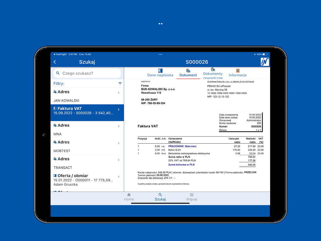 Znalezienie wszystkich informacji jest tak proste i szybkie jak "googlowanie". Nową jakość pracy mobilnej zapewni Ci aplikacja IN-Software APP (dostępnej na iOS i Android) oraz jej połączenie z IN-FORM.