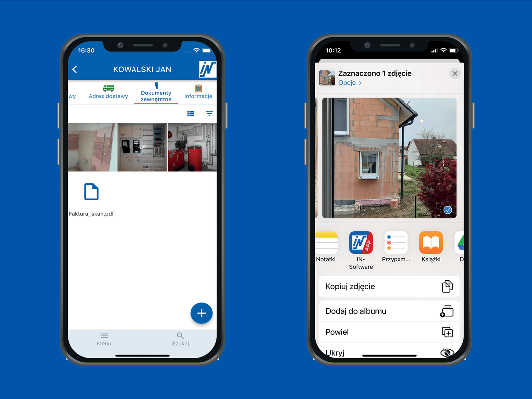 Aplikacja IN-Software APP daje Ci dostęp do wielu informacji przechowywanych w Twoim IN-FORM. W razie potrzeby z poziomu telefonu dodaj do IN-FORM coś nowego (np. zdjęcia z budowy, zeskanowane instrukcje obsługi, notatki itp.). To, co dokumentują pracownicy lub monterzy w terenie, jest natychmiast dostępne dla wszystkich innych współpracowników, zarówno w biurze, jak i poza nim.