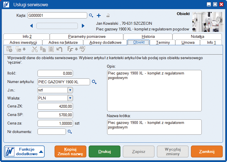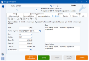 Na karcie serwisowej danego obiektu, za pomocą kilku kliknięć możesz sprawdzić wszystkie istotne parametry techniczne urządzenia, historię przeglądów oraz inne ważne informacje na temat zainstalowanych lub serwisowanych obiektów. Na przykład terminy wizyt, wymieniane części, protokoły z przeglądów, a także możesz załączyć szczegółową dokumentację graficzną, która ułatwi komunikację z klientem podczas przyjmowania zgłoszeń serwisowych lub rutynowych przeglądów.
