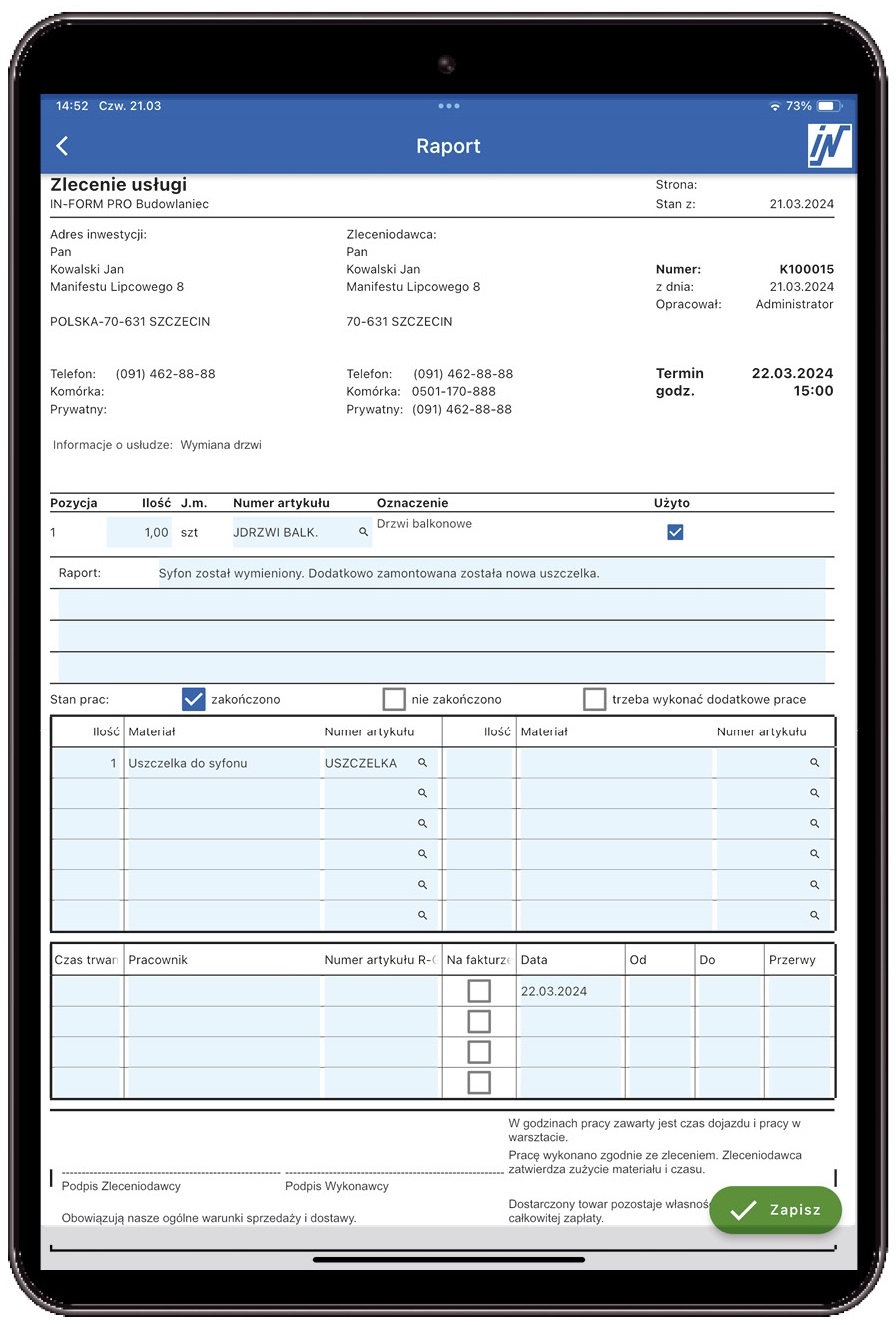 - możliwość obsługi zleceń serwisowych w formie elektronicznej poprzez urządzenia mobilne lub w formie tradycyjnej papierowej,